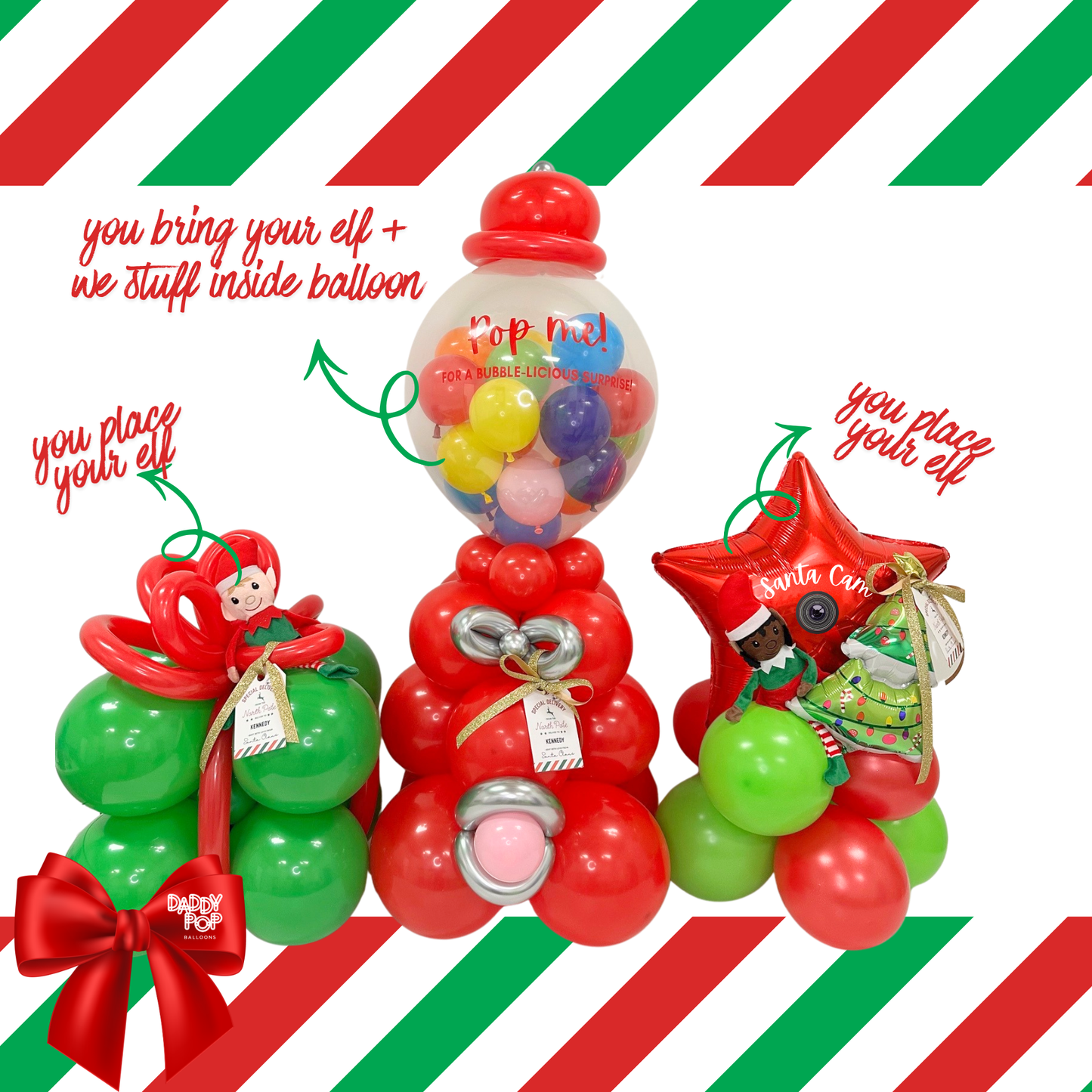 Several options can be picked up at our location in Mansfield, TX by appointment! These include helium jumbo balloons, helium balloon bouquets, balloon mosaics, and Daddy on the go Garlands.